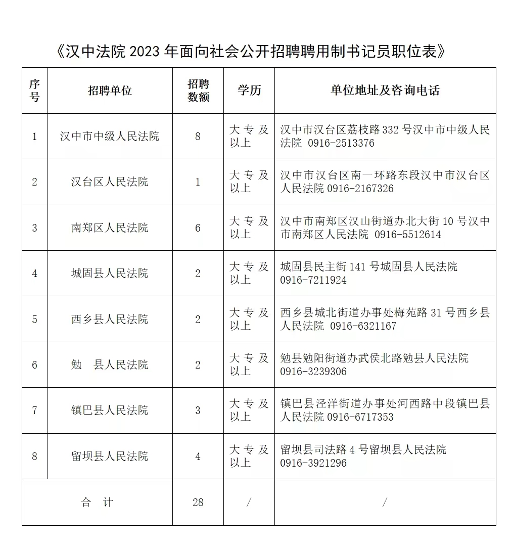 全市法院共招聘聘用制書記員28名,各法院招聘職位、地址及政策咨詢電話詳見《漢中法院2023年面向社會公開招聘聘用制書記員職位表》(附件)。