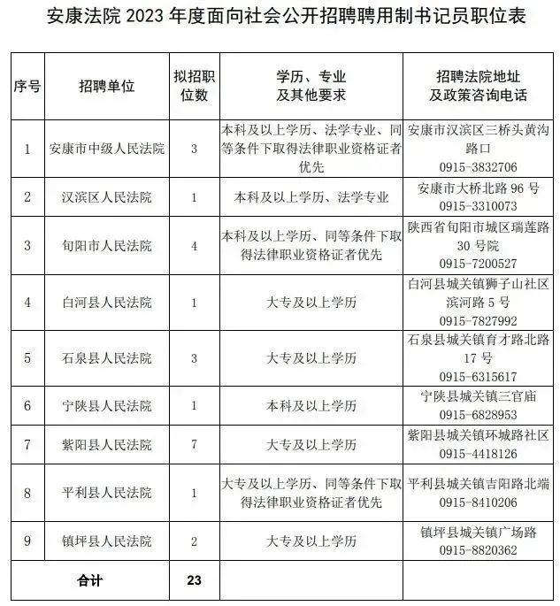 7.招聘崗位所需的其他具體條件及職位以《安康法院2023年度面向社會(huì)公開(kāi)招聘聘用制書(shū)記員職位表》公布為準(zhǔn);